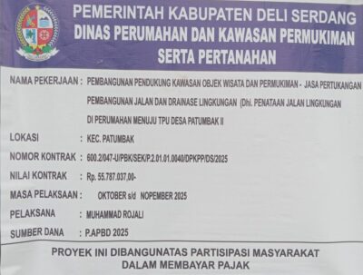Pada plank proyek menyebutkan, nama pekerjaan pembangunan pendukung kawasan objek wisata dan permukiman-jasa pertukangan pembangunan jalan dan drainase lingkungan dhi/ penataan jalan lingkungan di perumahan menuju TPU Desa Taumbak II, Kecamatan Patumbak.