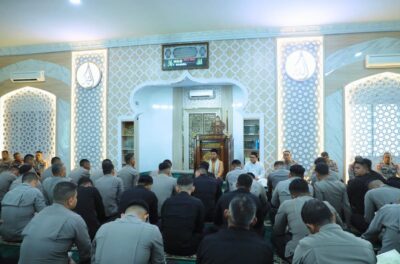 Personel Muslim mengikuti Binrohtal di Masjid Al-Barokah dengan tausiyah dan bimbingan dari Ustad Khoirul Zaman, S.H.I., S.Pd.I., yang mengajak seluruh personel untuk memperkuat keimanan serta menjaga integritas dalam setiap pelaksanaan tugas.