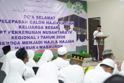 KOREKSI.co Medan, PTPN IV Regional 1 melepas 60 Jamaah Calon Haji/Hajjah (JCH), yang terdiri dari kayawan aktif dan pensiunan serta batih. Selasa (21/4/2026). Dalam kegiatan yang dilaksanakan di Medan itu, juga digelar do’a selamat untuk para jamaah yang akan menjalankan ibadah haji ke tanah suci Mekkah, hingga kembali ke Tanah Air.