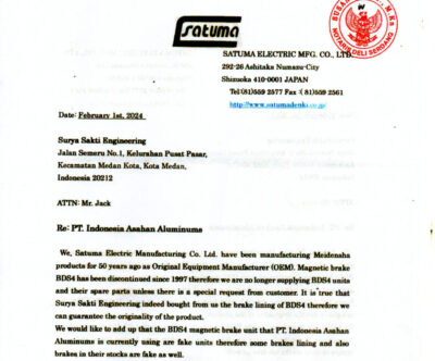 Selain itu, GM Pengadaan Barang PT Inalum juga telah menerbitkan PO shoe brake Meidensha ke vendor binaan yang selama ini menyuplai barang. Sementara, PO dari Desember 2024 hingga Januari 2025, diduga ada 64 unit barang shoe brake yang palsu sesuai surat Satuma OEM Meidensha yang telah ada Surat Terjemahan Tersumpah ke bahasa Indonesia, masuk status OK ke gudang Inalum.