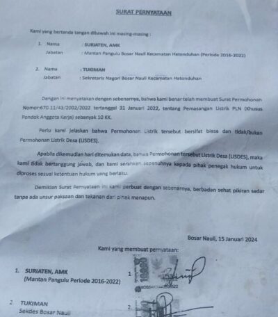 Hal itu tertuang dalam Surat Pernyataan mereka tertanggal 15 Januari 2024, yang menyebutkan bahwa pihaknya benar pernah mengajukan permohonan pemasangan listrik PLN khusus untuk pondok anggota kerja sebanyak 10 KK, melalui surat No 670.11/43/2002 tanggal 31 Januari 2022. Permohonan pemasangan listrik tersebut bersifat biasa atau umum dan tidak atau bukan Listrik Desa.